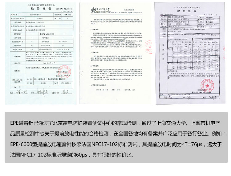 EPE系列提前放電避雷針(以下簡(jiǎn)稱EPE避雷針)采用法國(guó)技術(shù),符合法國(guó)NFC17-102標(biāo)準(zhǔn)。它由三種系統(tǒng)(大氣電力電容器、高壓脈沖發(fā)送系統(tǒng)、電流泄放系統(tǒng))組成,具有雙重瞬間放電裝置,被多層的具有隔絕惡劣環(huán)境及水密性的材料所保護(hù);無(wú)老化危險(xiǎn),免維護(hù)。在相同的安裝高度下,比普通瞬間避雷針的保護(hù)半徑大數(shù)倍,搶先放電時(shí)間為30μs~60μs,即優(yōu)先引雷入地。