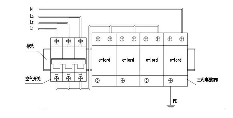 | 1. 已有可靠接地系統(tǒng),在配電柜(避雷器安裝處)的接地樁 (條)上進(jìn)行接地電阻的測定,電阻應(yīng)符合相關(guān)規(guī)范要求。(或 滿足國家、部級標(biāo)準(zhǔn))。 2. 配電柜中應(yīng)留有安裝避雷器的空間,水平寬度為18×4(72) mm,上下寬度為大于150mm(考慮接線的方便),前后為大于 100mm,同時應(yīng)有長為大于72mm的Ω型導(dǎo)軌,以固定避雷器。 3. 配套的配電柜應(yīng)滿足國家相關(guān)產(chǎn)品標(biāo)準(zhǔn)。 注:L為電源相線;N為電源零線;PE為地線。 1. 相線用6-25mm2紅色/綠色/黃色導(dǎo)線連接; 零線用6-25mm2黑色導(dǎo)線連接; 地線用16-35mm2黃綠色導(dǎo)線連接。 2. 為防止短路,在避雷器的上端應(yīng)安裝相應(yīng)的,曲線C的空氣開 關(guān)。 | 應(yīng)檢查空氣開關(guān)已經(jīng)合閘導(dǎo)通,以保證避雷器處于運行狀態(tài); 本產(chǎn)品只適用于室內(nèi)使用; 不要在雷雨天安裝。 |